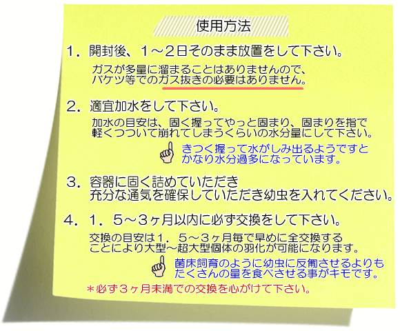 幼虫飼育用発酵マット★10リットル袋入り【要ガス抜き】 超大型幼虫に育てるため無発酵のホダ木オガをベースに添加剤と水を加えて発酵クワガタ幼虫飼育用昆虫マットです。 *必ず3ヶ月未満での交換を心がけて下さい。 *採卵用には不向きです 商品価格:2,080円 レビュー件数:1件 レビュー平均:5.0(5点満点) 楽天で購入 トップページへ